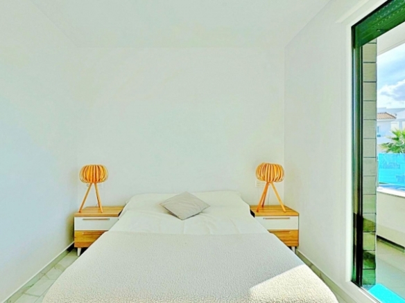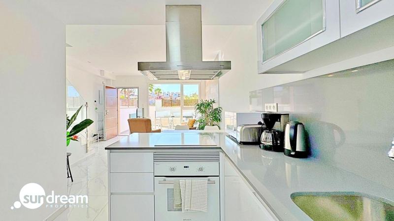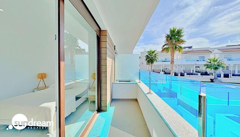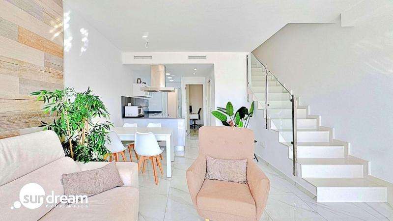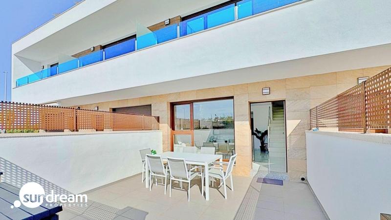 Este adosado dúplex de tres dormitorios y tres baños se encuentra en la exclusiva zona residencial de Los Balcones, en Torrevieja. La vivienda destaca por su diseño moderno, la luminosidad en cada estancia y sus amplias terrazas que permiten disfrutar del estilo de vida mediterráneo durante todo el año.En la planta baja, la vivienda dispone de un jardín privado de 22 m2 con espacio para comedor exterior. El interior cuenta con un salón de concepto abierto, decorado con un elegante revestimiento en la pared principal, conectado a una cocina moderna totalmente equipada con electrodomésticos y barra americana. En esta planta también se sitúa un dormitorio con armario empotrado, actualmente adaptado como zona de trabajo, además de un baño completo con ducha.En la planta superior se encuentran dos dormitorios, ambos con armarios empotrados, siendo el principal muy luminoso y con acceso directo a una terraza privada con vistas a la urbanización y a la piscina. En esta planta se ubican también dos baños completos con acabados de alta calidad.La vivienda cuenta con un amplio solárium privado con vistas despejadas a la laguna de Torrevieja, equipado con zona chill-out, pérgola, barbacoa y tumbonas, perfecto para disfrutar de reuniones al aire libre o de la tranquilidad del entorno.El residencial ofrece amplias zonas comunes con piscina comunitaria de gran tamaño rodeada de palmeras y zonas verdes, lo que genera un ambiente ideal tanto para familias como para quienes buscan un entorno relajado.La urbanización de Los Balcones es una de las más consolidadas de Torrevieja, con todos los servicios al alcance: supermercados, colegios, farmacias, zonas deportivas y el Hospital Universitario de Torrevieja. Las playas de Punta Prima y Torrevieja se encuentran a menos de 4 km, lo que convierte esta propiedad en una excelente opción tanto como residencia permanente como para inversión vacacional.