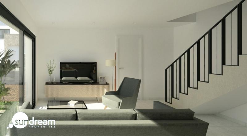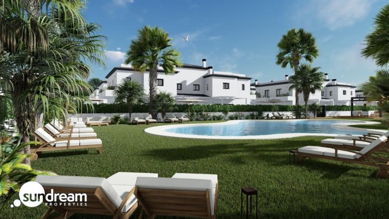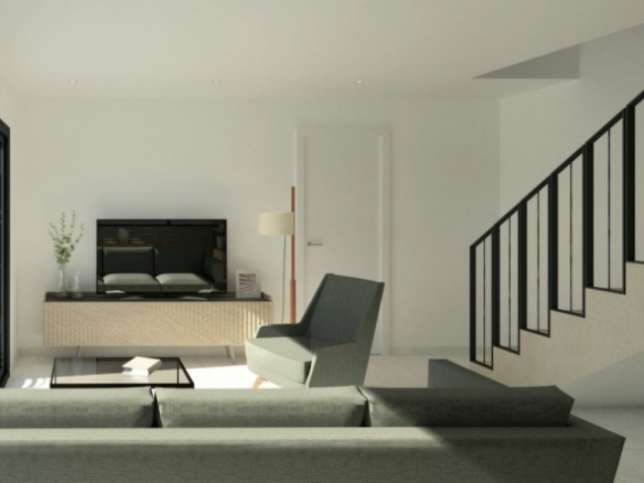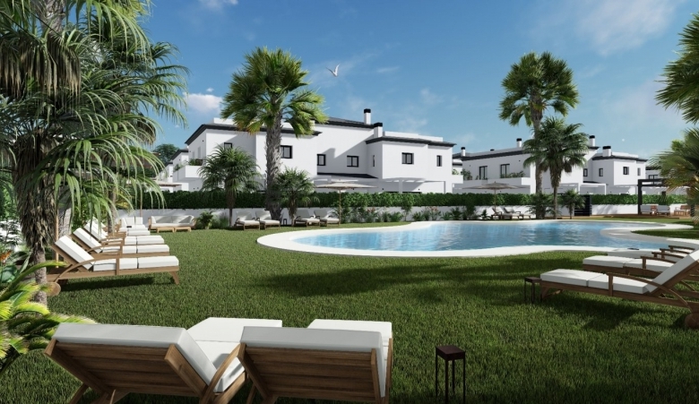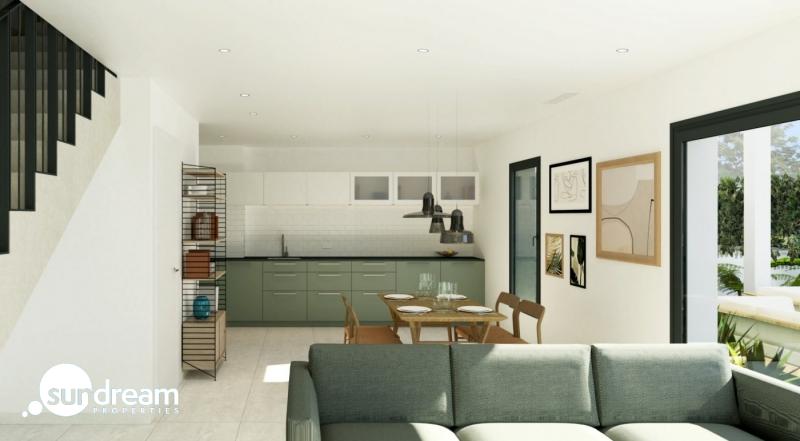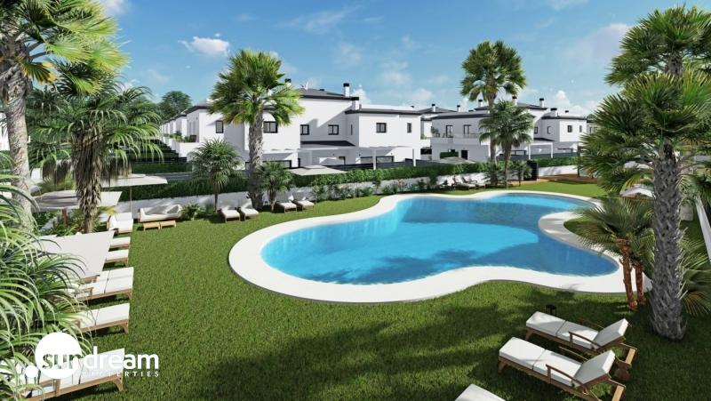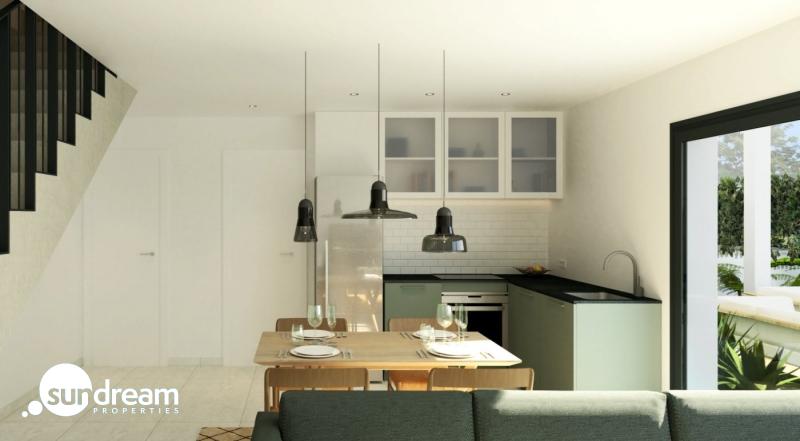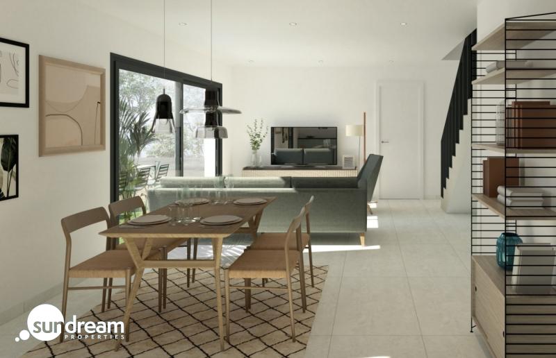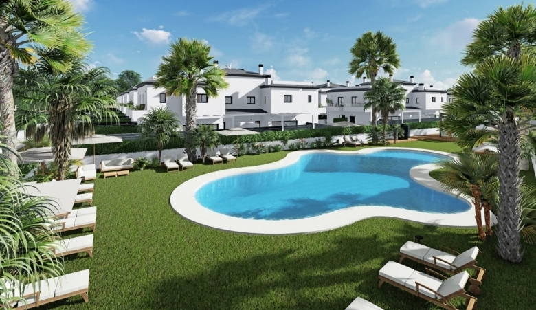 Adosados con 3 dormitorios en Gran Alacant Nueva residencia de diseño moderno con piscina comunitaria y la opción de elegir 2 o 3 dormitorios. La planta baja puede incluir un dormitorio, o en caso de que no haya necesidad de un tercer dormitorio, los metros adicionales se añadirán a la zona de salón-comedor. La cocina está equipada con vitro, extractor de humos y horno. Los baños están totalmente equipados. En la planta superior encontramos 2 dormitorios, ambas con baño en suite y el principal con acceso al balcón . Hay aire acondicionado por conductos en toda la vivienda. La zona exterior incluye aparcamiento, zona de terraza y jardín con césped artificial. Situado cerca del aeropuerto de Alicante y las playas de Arenales del Sol y Carabassi.