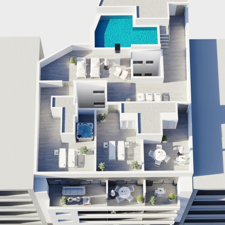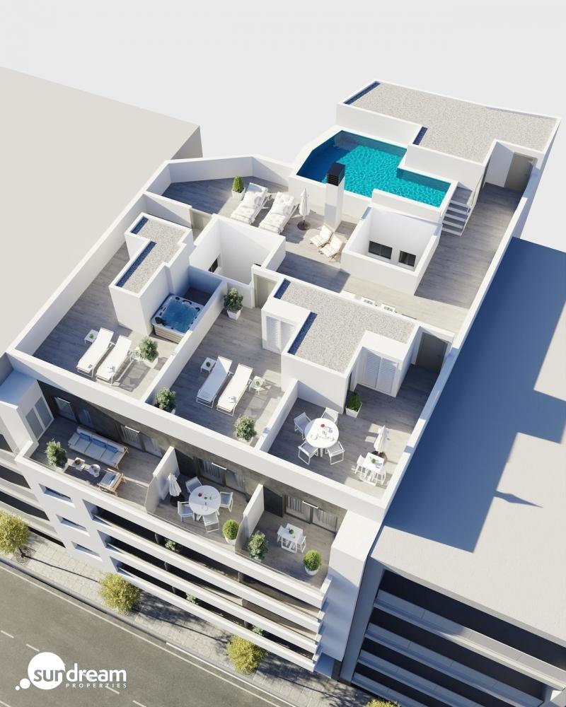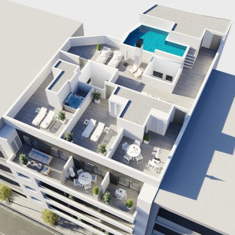 Apartamento de nueva construcción con 3 dormitorios a escasos pasos de la playa(Torrevieja)Ubicación privilegiada en el corazón de TorreviejaDescubra estos apartamentos y áticos a estrenar en una de las zonas más cotizadas de Torrevieja, a solo 400 m de la Playa del Cura y a 150 m del paseo marítimo. Situado en el centro de la ciudad, este animado barrio ofrece todos los servicios esenciales a poca distancia, incluyendo supermercados, tiendas, restaurantes, cafeterías y transporte público. Torrevieja es una conocida ciudad costera de la Costa Blanca, famosa por su clima mediterráneo templado, su animado ambiente y su estilo de vida junto al mar durante todo el año.Apartamentos modernos con distribuciones espaciosasEsta exclusiva promoción nueva consta de solo 12 apartamentos y áticos de 2 o 3 dormitorios, diseñados para ofrecer comodidad, funcionalidad y estilo contemporáneo. Los apartamentos de las plantas intermedias cuentan con amplias terrazas, mientras que los áticos disfrutan de un solárium privado adicional, ideal para tomar el sol o comer al aire libre. Todas las viviendas incluyen una cocina abierta conectada con el salón-comedor, lo que crea interiores luminosos y acogedores. Los dormitorios cuentan con armarios empotrados y los baños están totalmente equipados con muebles, espejos y mamparas de ducha. Hay plazas de aparcamiento subterráneo y trasteros opcionales disponibles con un coste adicional.Acabados de calidad y características de eficiencia energéticaLos apartamentos están construidos con materiales de alta calidad y un fuerte enfoque en la eficiencia energética. La carpintería exterior de aluminio incluye tecnología de rotura de puente térmico y doble acristalamiento para el aislamiento térmico y acústico. Las persianas motorizadas añaden comodidad y seguridad. Cada vivienda cuenta con preinstalación de aire acondicionado y calefacción por conductos, puertas de entrada reforzadas y puertas interiores lacadas en blanco. El agua caliente se produce mediante un sistema aerotérmico, lo que reduce el consumo de energía y mejora la sostenibilidad.Solárium en la azotea con piscina comunitariaLos residentes pueden disfrutar de un solárium exclusivo en la azotea con piscina comunitaria, accesible por ascensor o escaleras. Esta zona privada es perfecta para relajarse, tomar el sol y disfrutar de las vistas panorámicas de la ciudad. Ofrece un refugio tranquilo sobre las animadas calles de Torrevieja y añade un valor significativo a la promoción.Estilo de vida y alrededores de TorreviejaTorrevieja es conocida por su extenso litoral, sus playas de arena y sus emblemáticas salinas. El Parque Natural de las Lagunas de La Mata y Torrevieja se encuentra a unos 5 km y ofrece rutas de senderismo y paisajes únicos. Varios campos de golf, como Villamartin Golf y Las Colinas Golf, se encuentran a entre 12 y 18 km. El puerto deportivo y el puerto de Torrevieja están a aproximadamente 1 km. El aeropuerto de Alicante está a unos 45 km y el aeropuerto internacional de Murcia a unos 65 km, ambos con excelentes conexiones europeas.Su hogar en la costa le esperaNo pierda esta oportunidad de adquirir un moderno apartamento de nueva construcción cerca de la playa en Torrevieja. Póngase en contacto con nosotros hoy mismo para obtener más información o concertar una visita privada.