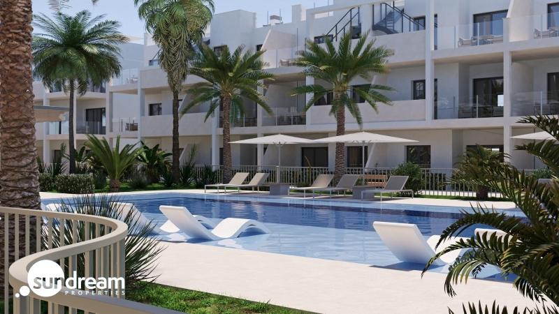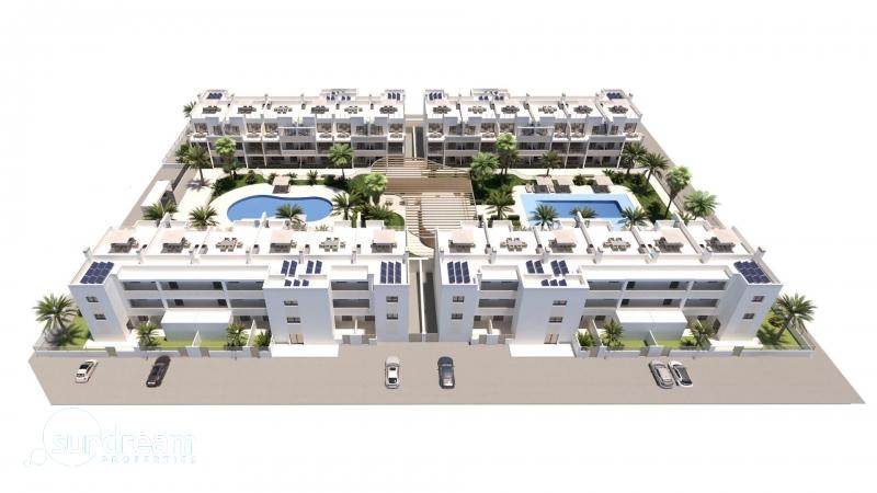 Apartamento de nueva construcción de 3 dormitorios a la venta en San Cayetano, Torrepacheco, MurciaVida contemporánea en un tranquilo entorno mediterráneoEste exclusivo complejo residencial de nueva construcción está situado en San Cayetano, Murcia, en el municipio de Torre Pacheco, a solo 9 km del mar y rodeado de varios campos de golf de renombre. El proyecto combina tranquilidad, comodidad y diseño contemporáneo, ofreciendo un entorno ideal para vivir de forma permanente, pasar las vacaciones o invertir en la Costa Cálida.La promoción consta de 72 apartamentos de 2 y 3 dormitorios y 2 baños, uno de ellos en suite, distribuidos en cuatro modernos edificios. También está prevista una segunda fase con bungalows y villas, lo que añadirá aún más valor y atractivo a la zona.Zonas comunes diseñadas para el relax y el bienestarLos residentes disfrutarán de espacios comunes cuidadosamente ajardinados que incluyen dos piscinas, hermosos jardines y un gimnasio totalmente equipado. Estas zonas crean un entorno agradable y social donde los vecinos pueden relajarse, hacer ejercicio y disfrutar del estilo de vida mediterráneo.El complejo residencial también cuenta con 40 kW de paneles solares fotovoltaicos que ayudan a sufragar los gastos de electricidad de la comunidad, contribuyendo a un entorno de vida más sostenible y eficiente desde el punto de vista energético.Apartamentos con espacios exteriores privados y soláriumCada apartamento está diseñado para aprovechar al máximo la vida al aire libre. Las propiedades de la planta baja incluyen jardines privados, los apartamentos de la primera planta ofrecen amplias terrazas y las viviendas de la última planta se benefician tanto de una terraza como de un solárium privado en la azotea. Todas las propiedades incluyen una cocina de verano en la terraza o el solárium, perfecta para disfrutar del sol durante todo el año.Todas las viviendas cuentan con una plaza de aparcamiento exterior y un trastero privado en el sótano, lo que añade comodidad y practicidad.Características de calidad e instalaciones energéticamente eficientesEstos apartamentos de nueva construcción se entregan con acabados de calidad e instalaciones modernas para garantizar el confort y la funcionalidad, incluyendo:Cocina totalmente equipada con electrodomésticosBaños totalmente equipados con muebles, espejos, iluminación y mamparas de duchaPreinstalación para aire acondicionado por conductosSistema aerotérmico para agua calienteLa combinación de materiales modernos y sistemas energéticamente eficientes hace que estas viviendas sean ideales para su uso durante todo el año.Excelente ubicación cerca de golf, playas y serviciosSan Cayetano es un pueblo tranquilo y bien comunicado, con servicios locales, tiendas y comercios. Su ubicación estratégica permite un fácil acceso a las playas, los campos de golf y las principales conexiones de transporte.Las distancias clave a los puntos de interés incluyen:Playas del Mar Menor 9 kmRoda Golf 6 kmGolf La Serena 14 kmLos Alcázares 10 kmCartagena 30 kmAeropuerto de Murcia Corvera 25 kmAeropuerto de Alicante 90 kmAsegure hoy mismo su propiedad en San CayetanoEste moderno complejo residencial ofrece una excelente oportunidad para disfrutar de la vida mediterránea en una zona tranquila y bien comunicada. Póngase en contacto con nosotros hoy mismo para obtener más información y reservar su apartamento de nueva construcción en San Cayetano.