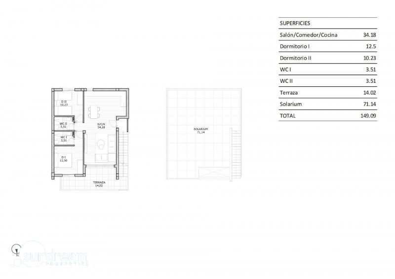 Bungalow de planta alta de 2 dormitorios con solarium privado a la venta en San Miguel de SalinasResidencial de obra nueva de bungalows 2 y 3 dormitorios, en planta baja con jardín privado o planta alta con solarium privado. en San Miguel del Salinas.La vivienda consta de 2 dormitorios y 2 baños, salón-comedor-cocina, terraza y solarium privado.Un exclusivo complejo residencial que ofrece viviendas de alta calidad con excelente aislamiento térmico y acústico, acabados de primera calidad y completas instalaciones. Las instalaciones incluyen dos piscinas, amplias zonas ajardinadas y zonas comunes bien diseñadas, que garantizan un entorno confortable y seguro. Cada vivienda cuenta con modernas cocinas amuebladas, suelos porcelánicos y eficientes sistemas de fontanería y aire acondicionado.Residencial situado en San Miguel de Salinas cerca de los campos de golf de Las Colinas y Campoamor, centros comerciales, las lagunas de Torrevieja y La Mata y las playas de Orihuela Costa.San Miguel de Salinas es un municipio de la Comunidad Valenciana, España. Situado al sur de la provincia de Alicante, en la comarca de la Vega Baja del Segura cerca de la Región de Murcia.El aeropuerto de Alicante se encuentra a 35 minutos en coche y el aeropuerto de Murcias Corvera a 1 hora en coche.