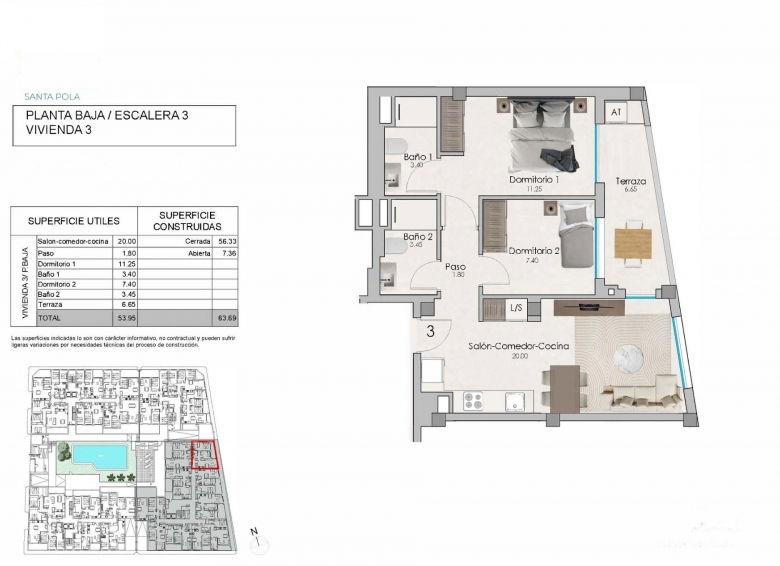MODERNO APARTAMENTO DE PLANTA BAJA DE NUEVA CONSTRUCCIÓN DE 2 DORM. EN SANTA POLAResidencial cerrado de nueva construcción compuesto por viviendas de 1, 2 y 3 dormitorios y 2 baños completos. El complejo cuenta con hermosas y amplias zonas comunes ajardinadas, que incluyen piscina, zona de relax y gimnasio. Esta vivienda consta de 2 dormitorios, 2 baños( uno de ellos en suite), salón-comedor-cocina y terraza. Las viviendas están diseñadas con acabados de alta calidad y un estilo moderno. Disfruta de sus amplias terrazas, donde podrás relajarte, organizar cenas al aire libre y contemplar los atardeceres más espectaculares. Todos los apartamentos incluyen por un coste adicional una plaza de garaje y un trastero.La ubicación es simplemente inmejorable, junto al centro de Santa Pola y el palmeral, y a tan sólo unos minutos del paseo marítimo, cerca de todos los servicios como restaurantes, bares, supermercados, farmacias etc…. Excelente conexión con la carretera nacional 332, que comunica toda la Costa Blanca sur, y con el aeropuerto en tan sólo 15 minutos.No dude en solicitar más información y programe una cita con nosotros.