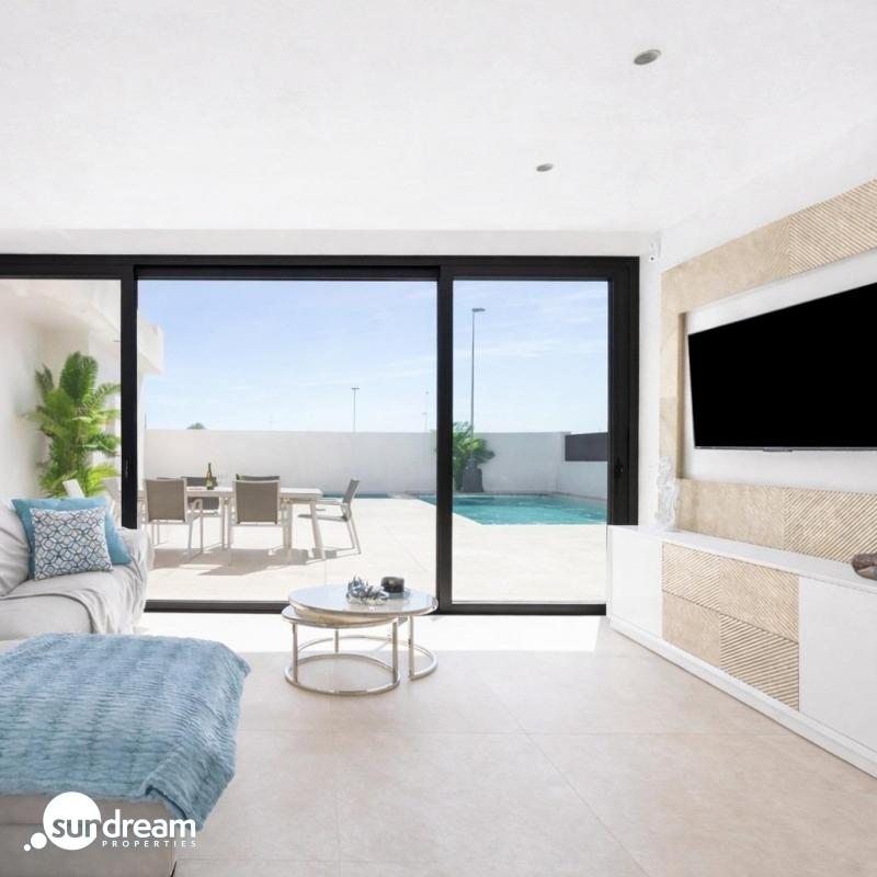 Villa de nueva construcción en una sola planta con 3 dormitorios y piscina privada en Los AlcázaresExclusiva promoción boutique cerca del campo de golf y la playaDescubra esta exclusiva promoción residencial de tan solo ocho villas independientes de nueva construcción, con una ubicación ideal entre La Serena Golf y la encantadora localidad costera de Los Alcázares. Situadas a solo 1500 metros de las playas del Mar Menor, estas viviendas ofrecen la combinación perfecta de golf, mar y estilo de vida mediterráneo.La ubicación permite a los residentes disfrutar de un acceso a pie tanto al campo de golf como al centro de la localidad, donde se puede encontrar una amplia variedad de restaurantes, tiendas, cafeterías y servicios esenciales. Los Alcázares es conocida por su ambiente relajado, su largo paseo marítimo y sus aguas cálidas y poco profundas, lo que la convierte en un destino popular tanto para turistas como para residentes permanentes.Villas modernas con distribuciones flexiblesEstas villas contemporáneas están disponibles en configuraciones de dos o tres dormitorios, con opciones de diseño de una sola planta o de dos plantas. Construidas en parcelas privadas a partir de 200 m2, cada vivienda está diseñada para maximizar el espacio, el confort y la luz natural.Todas las villas cuentan con piscina privada y aparcamiento en la parcela, lo que crea un entorno exterior privado y funcional, ideal para disfrutar del clima soleado durante todo el año.Las villas de una sola planta incluyen un solárium privado en la azotea, perfecto para tomar el sol o relajarse con vistas despejadas. Las villas de dos plantas ofrecen amplias terrazas en la planta superior, lo que proporciona zonas de estar al aire libre adicionales.Espacios diáfanos y conexión con el exteriorLa distribución interior se centra en espacios diáfanos, con luminosas zonas de salón y comedor perfectamente conectadas con modernas cocinas. Los grandes ventanales permiten que la luz natural inunde los espacios, al tiempo que ofrecen acceso directo a las terrazas y a las zonas de piscina.Este diseño potencia el estilo de vida que combina el interior y el exterior, característico de la Costa Cálida, lo que hace que estas villas sean ideales tanto para la vida cotidiana como para recibir invitados.Acabados de alta calidad y prestaciones modernasLas villas se han construido siguiendo unos altos estándares, utilizando materiales de calidad y marcas de confianza. Entre las prestaciones se incluyen una puerta de entrada de seguridad reforzada de DIERRE, armarios empotrados y cocinas modernas equipadas con electrodomésticos BOSCH.Otras especificaciones incluyen un sistema aerotérmico para agua caliente, persianas motorizadas y una puerta de acceso para vehículos automatizada. Se ha prestado especial atención a cada detalle para ofrecer comodidad, eficiencia y practicidad.Ubicación privilegiada en la Costa CálidaLos Alcázares ofrece una ubicación excelente con fácil acceso a playas, campos de golf y conexiones de transporte. Las playas del Mar Menor están a solo 1,5 km, mientras que el campo de golf La Serena se encuentra a poca distancia a pie.Otras distancias clave incluyen el aeropuerto de Murcia-Corvera a 35 km, Cartagena a 25 km, la ciudad de Murcia a 50 km y el aeropuerto de Alicante a 90 km.Oportunidad ideal de inversión o vivienda vacacionalEstas villas de nueva construcción ofrecen una oportunidad única de adquirir una propiedad moderna en una ubicación privilegiada, cerca tanto del mar como del golf.Póngase en contacto con nosotros hoy mismo para obtener más información o concertar una visita y asegurarse su nueva villa en Los Alcázares.
