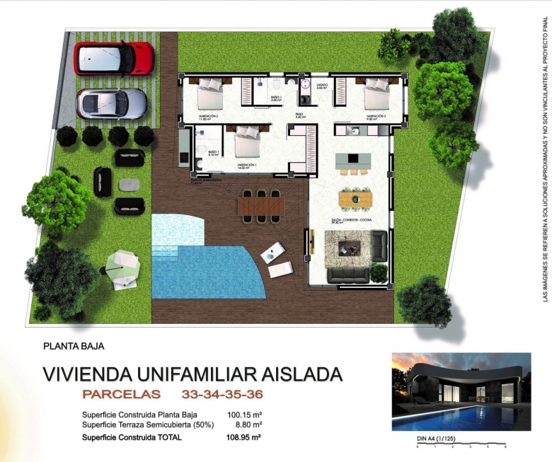 VILLA DE UNA PLANTA DE NUEVA CONSTRUCCIÓN EN LOS MONTESINOSProyecto de Obra Nueva situado en Los Montesinos, en una ubicación privilegiada cerca de las mejores playas de Guardamar y con todas las comodidades que ofrece un gran municipio como Los Montesinos. Este proyecto cuenta con 32 villas, algunas pareadas en 2 plantas y otras independientes en una sola planta, que se entregan con el mejor equipamiento, incluyendo solarium, mamparas de baño, jardín acabado con césped artificial de la mejor calidad, elementos decorativos de jardinería, y preinstalación para placas solares, toma eléctrica y motor de puerta para vehículos.Villa dispone de 3 dormitorios, 3 baños, cocina americana con salón, armarios empotrados, terraza. El típico pueblo de Los Montesinos está estratégicamente situado a 10 minutos en coche de las playas y del ocio de Torrevieja (con todos los servicios de una gran ciudad: teatro, 2 hospitales, colegios internacionales, etc.), de varios campos de golf y con fácil acceso a la autopista A7 para llegar al aeropuerto de Alicante en 20 min.En la urbanización hay supermercados y bares para el servicio diario, siendo un entorno rural y tranquilo.El clima de esta zona garantiza 300 días de sol al año con una temperatura media de 20ºC, lo que unido a la rica gastronomía y oferta cultural y deportiva de sus alrededores, hacen de esta zona un lugar ideal para establecer una segunda residencia vacacional o un lugar tranquilo para vivir de forma permanente.
