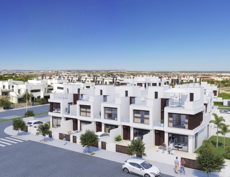 Vivienda adosada de 3 dormitorios a pocos metros de la Playa de Las Higuericas(Torre de la Horadada).Viviendas modernas en Torre de la HoradadaLa vivienda consta de de 3 plantas.. En la planta baja se encuentra 1 dormitorio, 1 baño, paatio y jardín. En la planta alta hay 2 dormitorios, 1 baño, 2 terrazas y gran solarium privado en la útima planta.Situada en la pintoresca localidad costera de Torre de la Horadada, esta nueva promoción está perfectamente ubicada a sólo 200 metros de la impresionante Playa de Las Higuericas. Ofreciendo modernos dúplex, bungalows de planta baja con jardín privado, bungalows de planta alta con solarium y elegantes apartamentos, esta comunidad combina el diseño contemporáneo con un toque de exclusividad. Las viviendas, de 2 y 3 dormitorios, se adaptan a las necesidades de cada estilo de vida.Excepcionales servicios comunitariosTodas las viviendas disponen de aparcamiento privado, amplias terrazas, zonas verdes ajardinadas y acceso a una piscina comunitaria. Estas viviendas, cuidadosamente diseñadas para mejorar el confort y la comodidad, ofrecen un entorno perfecto para relajarse y disfrutar.Características premium para el máximo confortCada propiedad incluye:Persianas motorizadas en todas las habitaciones.Puertas delanteras reforzadas para mayor seguridad.Calefacción por suelo radiante en los baños.Muebles de baño y mamparas de ducha.Iluminación exterior de terrazas y jardines.Electrodomésticos incluidos: campana extractora, vitrocerámica, horno, frigorífico, lavavajillas, microondas y lavadora.Además, los bungalows de planta baja y los solariums cuentan con duchas de agua caliente y fría, mientras que todas las viviendas se benefician de un sistema aerotérmico de bajo consumo para el agua caliente.Ubicación privilegiada en Torre de la HoradadaEsta urbanización está situada en una zona vibrante pero tranquila, con fácil acceso a los servicios y atracciones esenciales:Playa de Las Higuericas: A sólo 200 metros.Aeropuerto de Murcia: Aproximadamente a 30 km.Campo de Golf Lo Romero: A tan sólo 10 km.Centro Comercial Dos Mares: 11 km.Puerto de San Pedro del Pinatar: 8 km.Disfrute de un estilo de vida costero único, combinando hermosas playas, opciones gastronómicas y actividades de ocio muy cerca.La casa de sus sueños le esperaNo pierda la oportunidad de poseer una casa moderna y bien equipada en uno de los lugares más deseados de la Costa Blanca. Póngase en contacto con nosotros hoy mismo para obtener más información o para concertar una visita.
